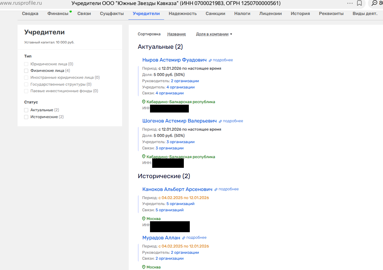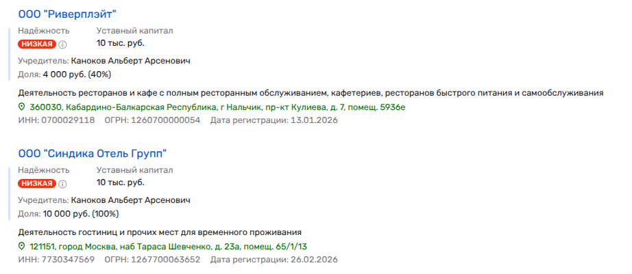 Альберт Арсенович Каноков в январе-феврале 2026 года слегка перетряхнул свой бизнес-портфель: продал одну ресторанную фирму в Нальчике - «Южные Звезды Кавказа», создал следом другую - «Риверплэйт», а также в Москве - гостиничное «Синдика Отель Групп», которое подозрительно похоже на будущую материнскую компанию для сбора отельного бизнеса.