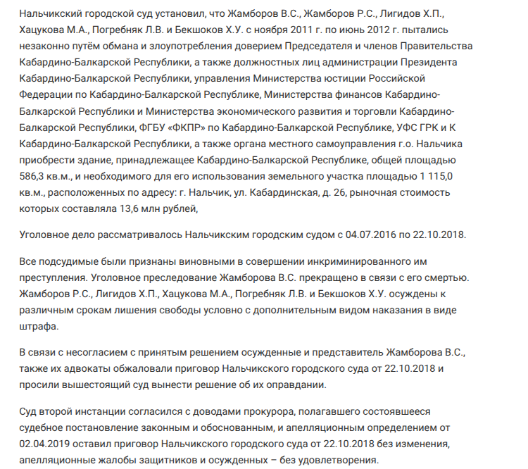 Ярким примером того, как Каноков и его семейка строили империю «Синдика», стало уголовное дело о мошенничестве, фигурантами которого в 2012 году стали глава администрации КБР Владимир Жамборов и экс-замминистра госимущества и земельных отношений Руслан Жамборов. Их обвинили в сливе по дешевке здания местной филармонии мадам Мадине Хацуковой, которая приходилась двоюродной сестрой жены главы республики. Сначала здание оценили в 20 млн, а потом оказалось, что ушло оно за 1 млн рублей. Все это стало известно, благодаря аудиозаписи, где даму поздравляют с удачной сделкой и звучат прочие ее детали.