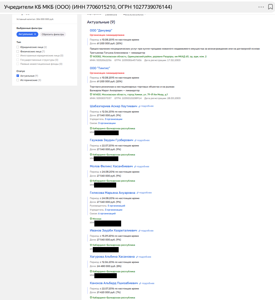 Упомянутый Межрегиональный клиринговый банк был частично в собственности и ООО «ТК "Синдика-о», которое принадлежит ширме Каноковоых - Марьяне Гилясовой, на кою оформлена компания Каноковых - ООО "Интур-Инвест" и она же имела долю в вышеуказанном банке, и является директором ряда фирм империи Каноковых. При этом ООО ТК «Синдика-о» владело ООО «Август», где наследила компания Альберта Канокова - ООО «БК».