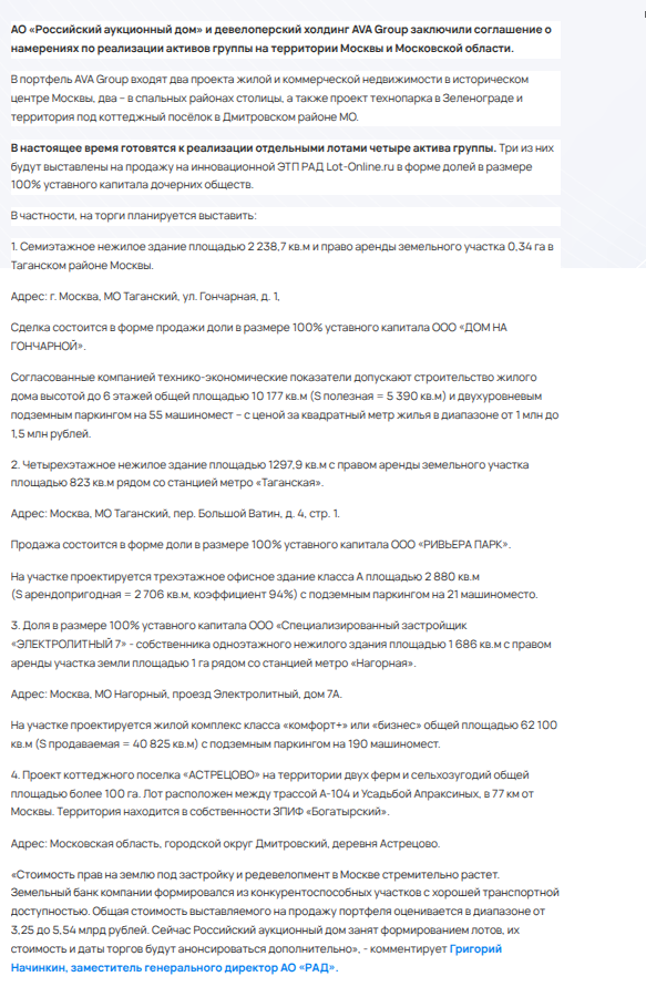 В число лотов попали - ООО «ДОМ НА ГОНЧАРНОЙ», на которое оформлена нежилая семиэтажка на ул. Гончарная, 1 в Москве и аренда участка на 0,34 га, ООО «РИВЬЕРА ПАРК» - владелец четырехэтажки в пер. Большой Ватин, д 4, стр 1 и участком под ним, ООО «Специализированный застройщик «ЭЛЕКТРОЛИТНЫЙ 7» - владелец нежилого здания площадью 1 686 кв.м с правом аренды 1 га земли около станции метро «Нагорная». Три площадки пригодны под жилищное строительство, а сами объекты - под снос.