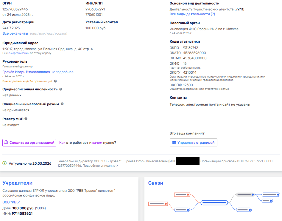 В конце июля 2025 года РВБ также сляпало собственное турагентство - «РВБ Трэвел», директором которой стал Игорь Грачёв. Последний руководит почти 40 фирмами дивизиона РВБ и Russ Outdoor, с покупкой которого Роберту Мирзояну, по слухам, помогали деньги сенатора Сулеймана Керимова.