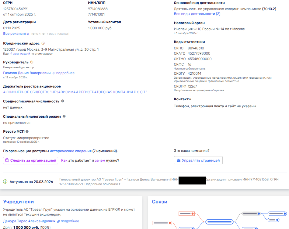 Занятный факт: несмотря на сообщения о покупке Fun&Sun компанией РВБ в ЕГРЮЛ владельцем его юрлица - ООО «ТТ-трэвел» до сих пор числится АО «Трэвел Груп», чьим учредителем указан Тарас Демура, связанный со структурами как раз таки олигарха Мордашова. Правда, директора в АО «Трэвел Груп» в ноябре 2025 года как раз сменили. Новым рулевым стал некий Денис Газизов, который также имел отношение к Севергрупп. Возможно, Демура теперь уже по наследству и прикрывает интересы Мирзояна (читай - Керимова).