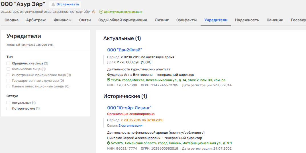 Создавалась же Azur Air на базе дочерней авиакомпании UTair - «Катэкавиа». Новым собственником «Азур Эйр» в 2015 году и стало ООО «Ван2флай», но обе фирмы убыточны: авиаперевозчик на 3,9 млрд рублей, а «Ван2флай» на 2,6 млн рублей.