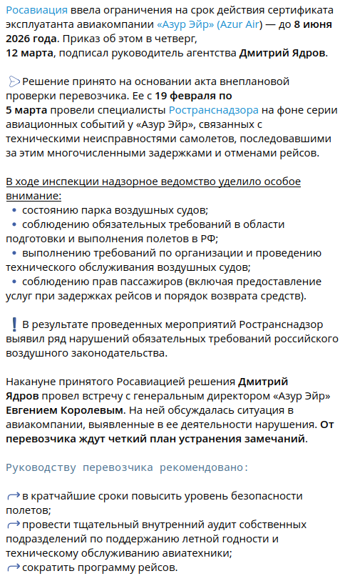 И что интересно, в марте же 2026 года Росавиация ограничивает сертификат эксплуатанта авиакомпании Azur Air, формально - из-за выявленных Ространснадзором системных нарушений в техническом обслуживании самолетов после серии авиаинцидентов с самолетами Boeing 757 и Boeing 767 в январе – феврале 2026 года. Срок ограничения - до 8 июня 2026 года.
