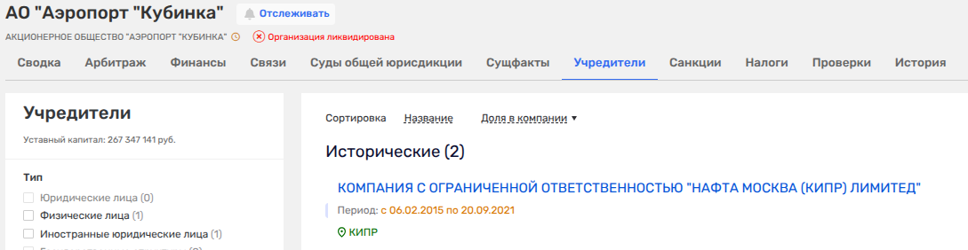 АО «Аэропорт Кубинка» ликвидировали в 2021 году, а владельцем оного было кипрское - «НАФТА МОСКВА (КИПР) ЛИМИТЕД», а Нафта Групп - это, как известно, как раз актив Керимова.