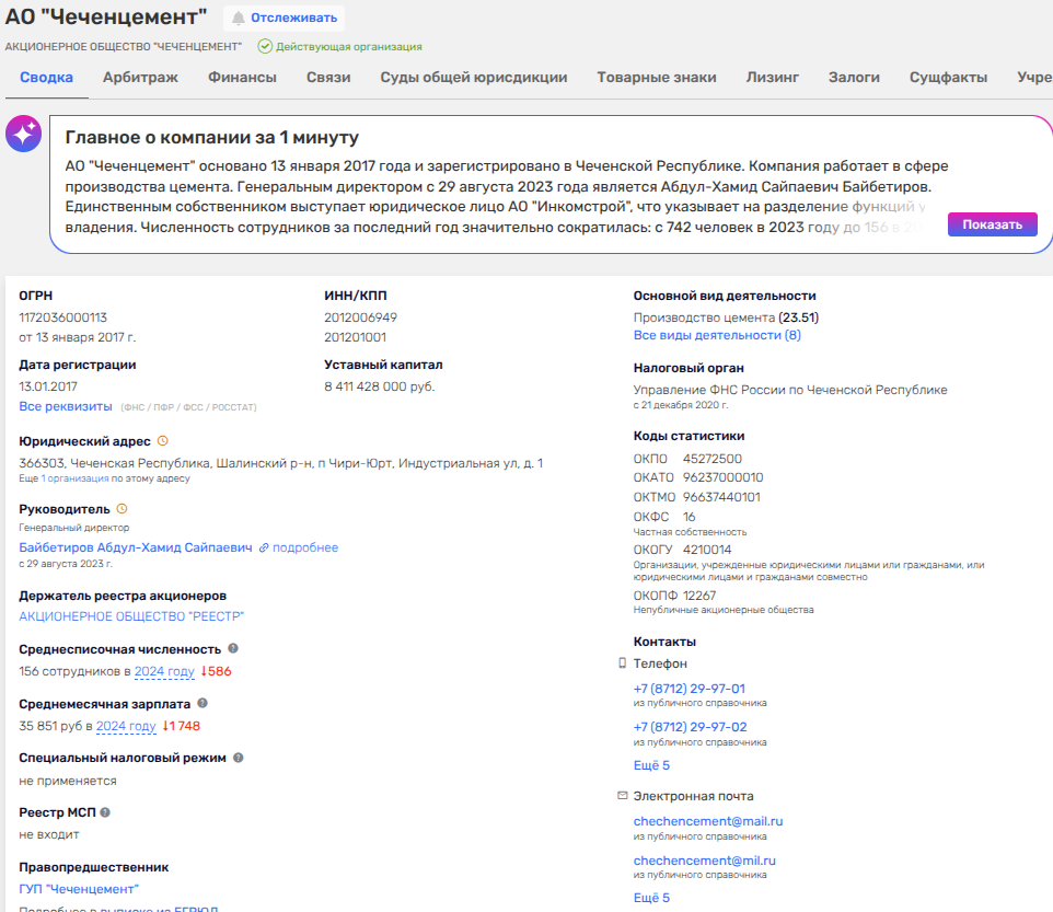 Но вот же, что интересно, другой протеже Кадырова - бывший главный аудитор Чечни, с которого мы и начали наш рассказ, в феврале 2026 года вдруг стал владельцем двух юрлиц, некогда принадлежавших «Чеченцементу» - ООО «Первый Цементный Завод» и ООО «Новый Цементный Завод». При этом по ОКВЭД эти заводы фигурируют как агентство по подбору персонала и стройфирма, вот только прописаны они по адресу как раз таки Чеченцемента. Уж не на эти ли компании планируется вывести ликвидное имущество и раздробить бывший госактив?