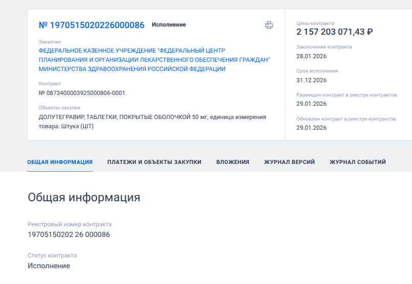 Ещё в конце января 2026 года Федеральный центр планирования и организации лекарственного обеспечения граждан Минздрава РФ подмахнул госконтракт на поставку препарата долутегравир на сумму 2,1 млрд рублей. Победителем признали единственного участника соответствующего тендера - некое АО «ГлаксоСмитКляйн Трейдинг», которое уже получило в целом на госконтрактах свыше 52 млрд рублей.