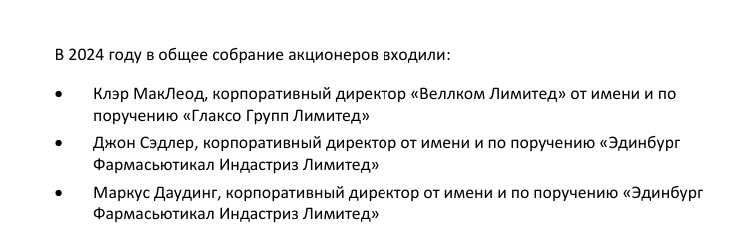 Отметим, в 2024 году в состав совета акционеров АО входили Клэр МакЛеод, корпоративный директор «Веллком Лимитед» от имени и по поручению «Глаксо Групп Лимитед», Джон Сэдлер, корпоративный директор от имени и по поручению «Эдинбург Фармасьютикал Индастриз Лимитед» и Маркус Даудинг, корпоративный директор от имени и по поручению «Эдинбург Фармасьютикал Индастриз Лимитед». Последнее - это еще одно из старейших фармгигантов Великобритании, ведущее историю с 1904 года и давно плотно слившаяся с британской политверхушкой.