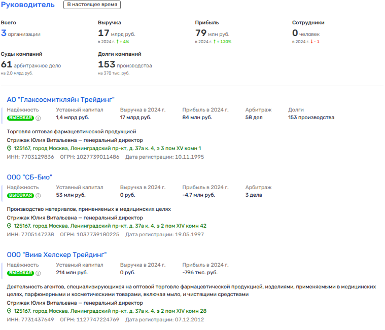 Так, директор АО «ГлаксоСмитКляйн Трейдинг» Стрижак одновременно с этим является директором ООО «СБ-Био» (производство материалов, применяемых в медицинских целях) и «Виив Хелскер Трейдинг» (агент по оптовой торговле фармпродукцией). Последнее принадлежит британской фирме ВИИВ ХЕЛСКЕР ОВЕРСИЗ ЛИМИТЕД.