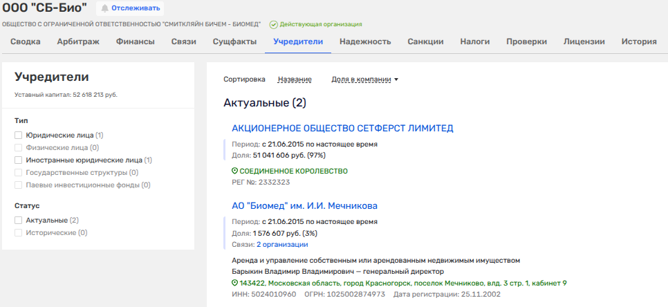 А вот ООО «СБ-Био» помогает раскрыть нам, кто мог лоббировать интересы британских компаний и открывать им доступ к бюджетной кормушке. Так, вместе с британской Сетферст Лимитед российской ООО-шкой владеет АО «Биомед им. И.И. Мечникова». Последнее, судя по сайту Фармстандарта, входит в дивизион такого примечательного персонажа на рынке российской фармы как Виктор Харитонин.