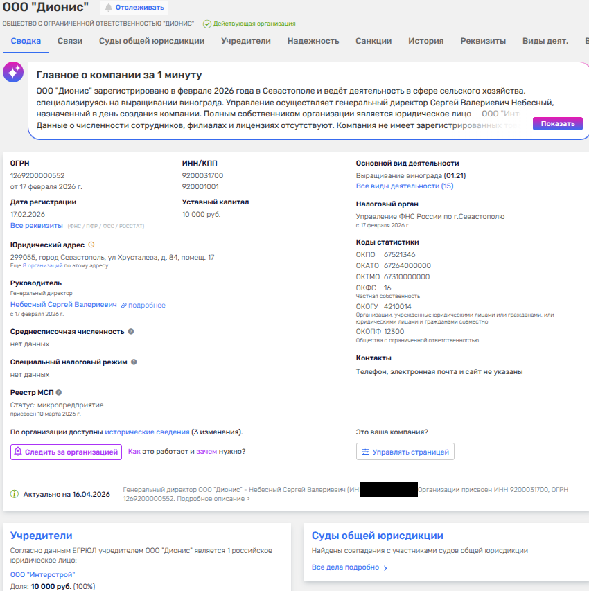 17 февраля 2026 года в Симферополе была зарегистрирована новая компания — ООО «Дионис», заявленная сфера деятельности которой звучит скромно: выращивание винограда. Учредителем выступил Сергей Небесный. Впрочем, отсылка к античному богу вина в названии явно выдаёт куда более амбициозные планы. Для Крыма, где климат буквально подталкивает к развитию виноделия, такой шаг выглядит логичной прелюдией к запуску собственной винодельни. А под такой бизнес нужны земли, а где их взять? Прийти к Аксенову и попросить. Свои же люди, чай не откажут.