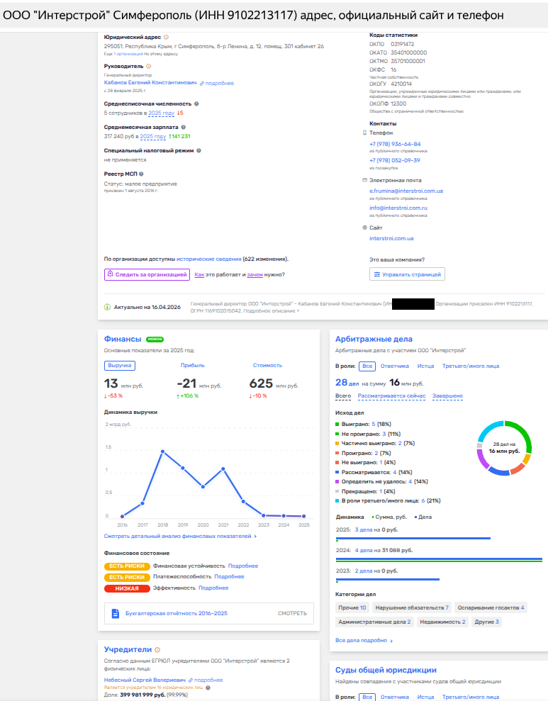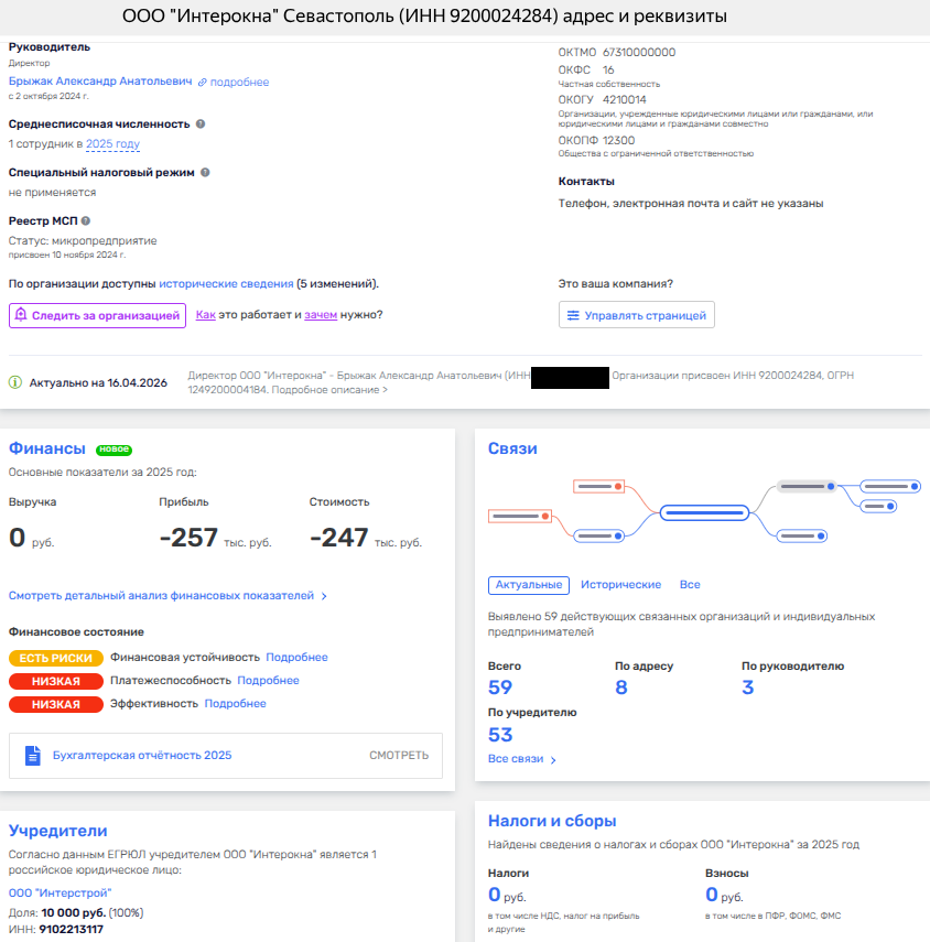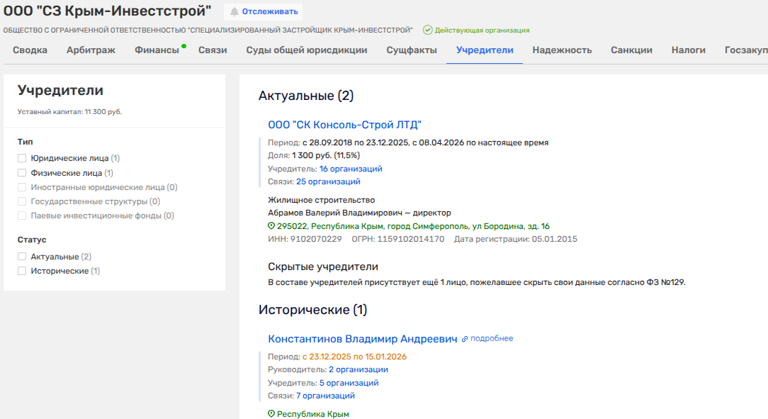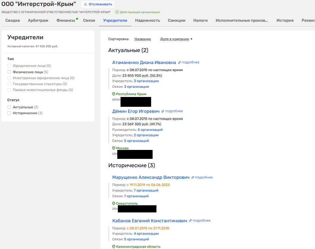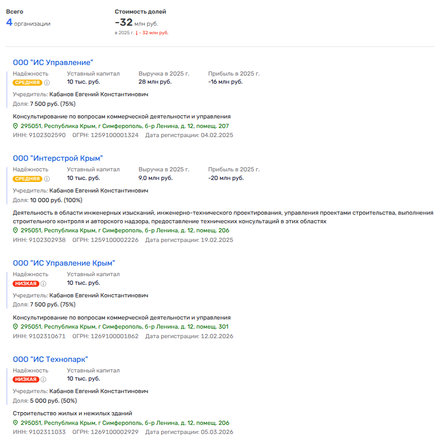 Засветилась в строительном бизнесе и родня бывшего чиновника, некая Надежда Кабанова, которой принадлежат доли в строительном ООО «Дементор» и ООО УК «Интерстрой». Из первой в марте 2026 года вышло ООО «Интерстрой-Крым». В последнем наследил Евгений Кабанов, а сейчас долю имеет некая Диана Ивановна Атаманенко и Егор Демин, который числится депутатом Ялтинской гордумы, где заседал и сын Константинова Олег.