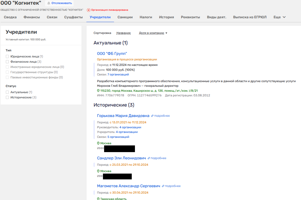 Именно это ООО в декабре 2024 года купило некое ООО «Когнитек», а в июне 2025 года его уже ликвидировали. При этом процедуру ликвидации фирмы, работающей в сфере ИТ, начали спустя 1,5 месяца после покупки.