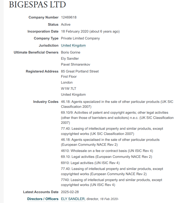 Более того, британская фирма действующая, а ее бенефициарами указаны Ely Sandler, Boris Gorine и Pavel Shmarenkov.