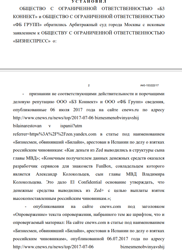 Кстати, именно «ФБ Групп» было истцом в иске, требуя в статье (ныне удалена везде) под наименованием «Бизнесмен, обвинявший «Билайн», арестован в Испании по делу о взятках российским чиновникам» оспаривало такие строчки: «Как деньги из Zed выводились в структуры сына главы МВД»; «Конечным получателем данных денежных средств оказался разработчик сервисов для знакомств FunBox, совладельцем которого является Александр Колокольцев, сын главы МВД Владимира Колокольцева. Это дало El Confidential основание утверждать, что денежные средства выводились из Zed+ с целью выплаты взяток высокопоставленным российским чиновникам».