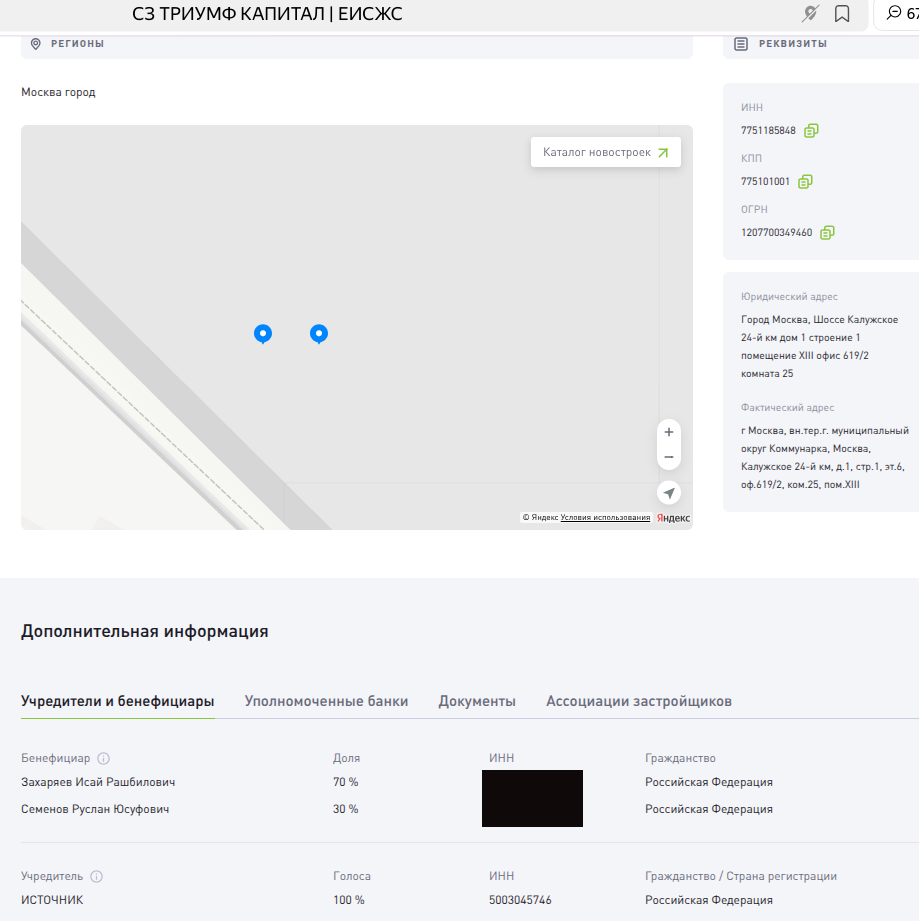 Под брендом холдинга скрывается разветвлённая сеть структур, набивающих кошельки в сегменте премиум-жилья. Показательный пример — входящее в периметр дивизиона ООО «СЗ Триумф Капитал», возводящее жилой комплекс SEZAR CITY. Если проследить цепочку владения через ООО «Источник», конечными выгодоприобретателями снова всплывают всё те же фигуры: Исай Рашбилович Захарьяев и Руслан Юсуфович Семёнов.