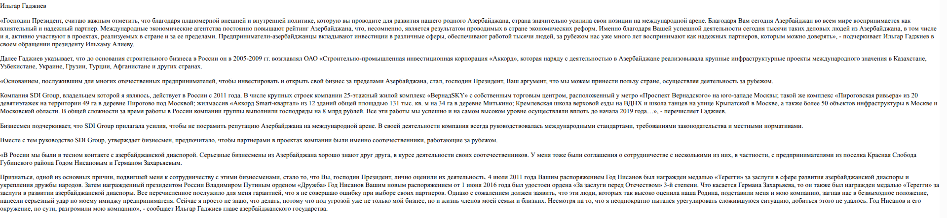 Оказавшись в критической ситуации, предприниматель адресовал открытое обращение… кому бы вы думали? Ильхаму Алиеву. В письме он просил азербайджанского лидера повлиять на Нисанова, который, по словам автора, не только прибрал к рукам его российские активы, но и открыто угрожает физической расправой. Обратите внимание на любопытную деталь: разбирательство, касающееся крупнейшего бизнеса в Москве и области, Гаджиев решил переложить на плечи зарубежного главы государства, а не на российские правоохранительные или судебные органы. Складывается ощущение, что политический вес Алиева настолько беспределен, что он способен лично определять, что и кем будет возводиться в самом сердце российской столицы. Удивительная, конечно, география влияния.