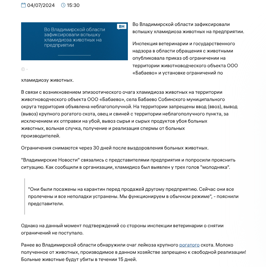 На фоне этого особо цинично смотрится бизнес самого Данкверта и его дочери Юлии, часть которого как раз в сфере молочного животноводства. Более того, когда в 2024 году на территории животноводческого объекта ООО «Бабаево», кои принадлежат Юлии Данкверт и АО «Агроплемсоюз», обнаружили очаг хламидиоза, никто под нож скотину не пустил. На предприятии просто ввели ограничительные меры, а скотину лечили, не считаясь с тратами на препараты.