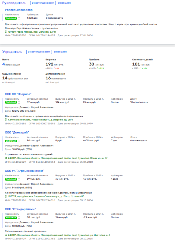 Головной актив их империи - управляющая компания «Агроменеджмент», где Данкверту лично принадлежит 88,15%, переданных для создания видимости законности в доверительное управление. Директором там сосед по дачам самого Данкверта и Патрушева Роман Мишин, который и помогает заколачивать капиталы чиновнику. Они так близки, что Данкверт даже отдал Мишину 25% в своей строительной фирме - «Домстрой» из Калужской области.