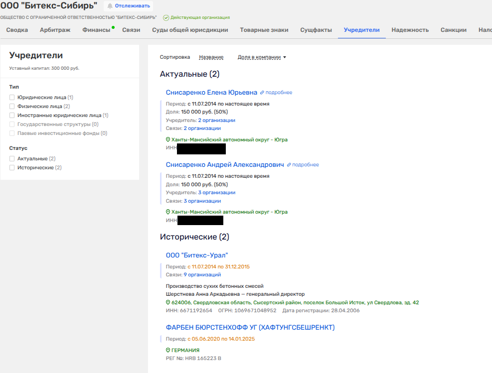 А самое интересное, что в бизнесе семейства Снисаренко отметились немецкие компании. Например, в ООО «Битекс-Сибирь» (производство красок) наследило ФАРБЕН БЮРСТЕНХОФФ УГ (ХАФТУНГСБЕШРЕНКТ), вышедшее из числа владельцев лишь в январе 2025 года.