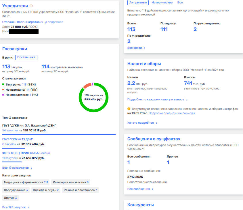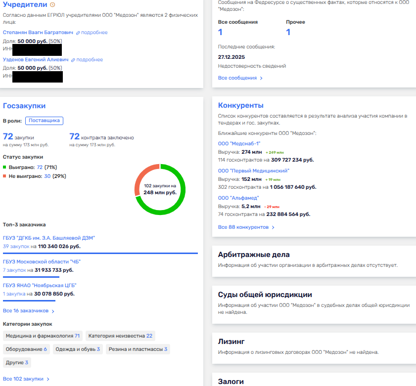 12 марта 2026 года у ничем непримечательной компании из Москвы, которая по сути перепродавец фармацевтической продукции, - ООО «Медозон» - сменились собственники. 50% получил Евгений Алиевич Узденов, а еще 50% - его партнер некий Ваагн Степанян. При этом годом ранее на последнего оформили еще одного крупного поставщика фармпродукции по госконтрактам - ООО «Медснаб-1» (321 млн рублей на госконтрактах)