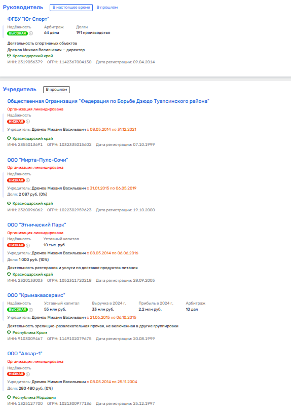 Так, Дремов был совладельцем также еще и ООО «Мирта-Пулс-Сочи», ООО «Алсар-1» (Мордовия) и ООО «Крымаквасервис» из Ялты. Из них не ликвидировано только последнее. При этом по компании «Мирта-Пулс-Сочи» партнерами чиновника выступали Владимир Фролов, Юрий и Кирилл Михайловы.