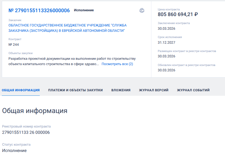 30 марта 2026 года областное государственное бюджетное учреждение «Служба заказчика (застройщика)» в Еврейской автономной области подмахнуло контракт на 805 млн рублей. Бюджетные средства направят на проектирование и возведение детской поликлиники в Биробиджане, на улице Пионерской.