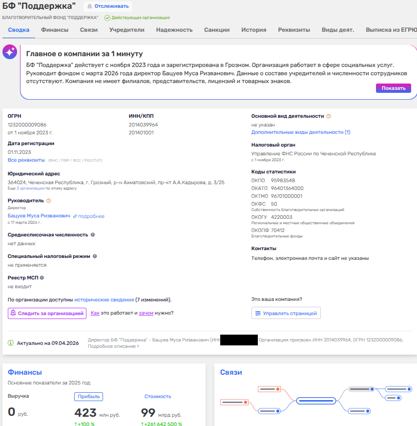 Еще один занятнейший факт: Бацуев с ноября 2023 года директор некоего благотворительного фонда «Поддержка», скрывающего своих учредителей. При этом при нулевой выручке чистая прибыль этого фонда по итогам 2025 года - 423 млн рублей при его же стоимости 99 млрд рублей.