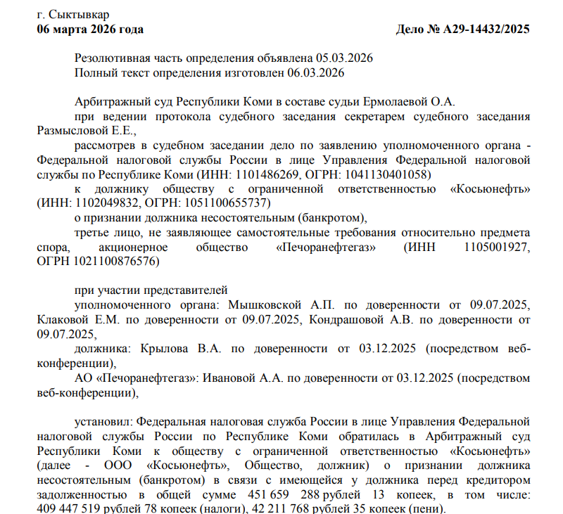 Тут не лишне напомнить, что в феврале 2026 года банк ВТБ сообщил о планах подать банкротные иски к ООО «Тарховское», ООО «Косьюнефть», ООО «Динью», ООО «Западно-Новомолодежное», ООО ЦНПСЭИ и АО «Печоранефтегаз», то есть банкротство и этих кубышек - вопрос времени.