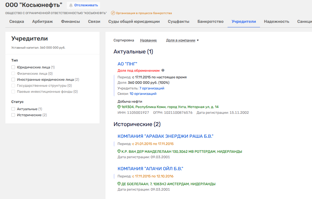 На ноябрь 2025 года астрономические налоговые долги были у ООО «Косьюнефть» - свыше 451,6 млн рублей, в связи с чем уже в марте 2026 года в отношении нее ввели первый этап банкротства - наблюдение. Что интересно, в биографии этого ООО с одним сотрудником и убытками при выручке в 1,2 млрд рублей наследили две нидерландские фирмы, что владели ею до ПНГ - АРАВАК ЭНЕРДЖИ РАША Б.В. и АПАЧИ ОЙЛ Б.В. Не туда ли уплывали капиталы?