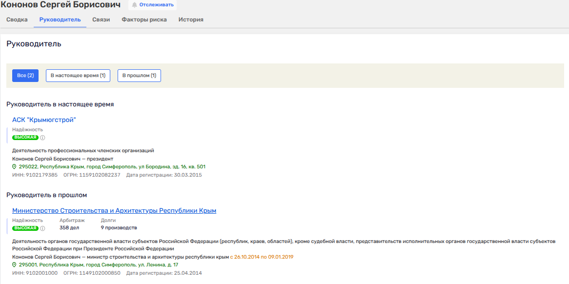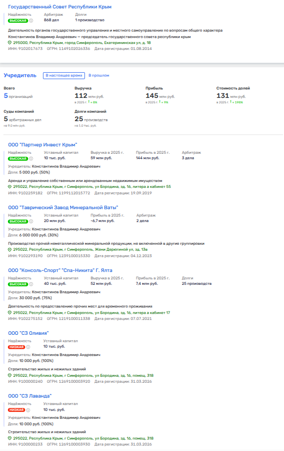 31 марта 2026 года реестр юридических лиц пополнился ещё двумя организациями — ООО «СЗ Лаванда» и ООО «СЗ Оливия». Обе компании зарегистрированы в Симферополе, а их уставной капитал составляет по десять тысяч рублей каждая, то есть юридический минимум, но впрочем фирмам такого зубра крымской политики - это мелочи, землю выделят и таким однодневкам, если что.