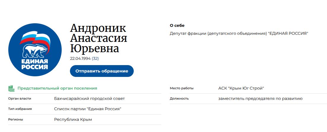Руководителем в обеих структурах назначена Анастасия Юрьевна Андроник - депутат Бахчисарайского горсовета, куда она прошла по списку «Единой России» — регионального отделения, которое (вот же совпадение!) курирует Константинов. При этом г-жа Андроник не ограничивается лишь политической деятельностью и параллельно занимает должность заместителя директора в Ассоциации строителей Крыма «КрымЮгСтрой».