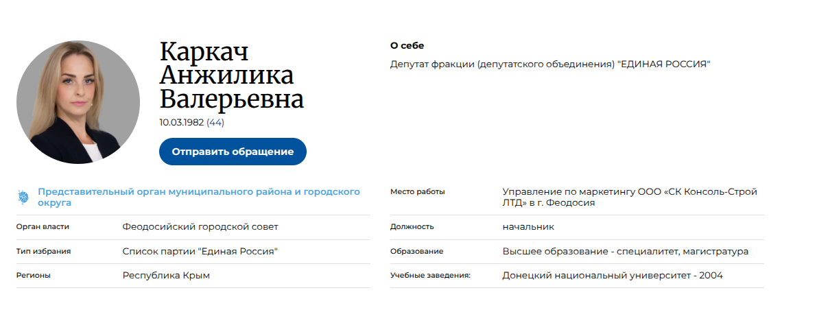 Не менее примечательно и то, что в орбиту этих свежеиспечённых фирм втянуты различные активы тех же Константиновых - через прописку по одному и тому же адресу. Одной из таких компаний — ООО «СЗ Победа» — руководит Анжелика Валерьевна Каркач. Данная мадам числится в штате ещё одного предприятия, связанного с Константиновыми, и одновременно заседает в Феодосийском городском совете.