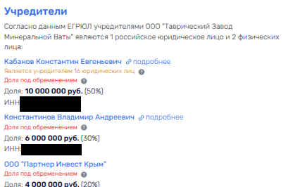 Личные контакты отца Кабанова со спикером Госсовета Константиновым чётко прописаны в корпоративных схемах. Например, в одном случае связующим звеном выступает ООО «Партнер Инвест Крым»: эта структура владеет долей в ООО «Таврический завод минеральной ваты», где пай имеет и сам Константин Кабанов.