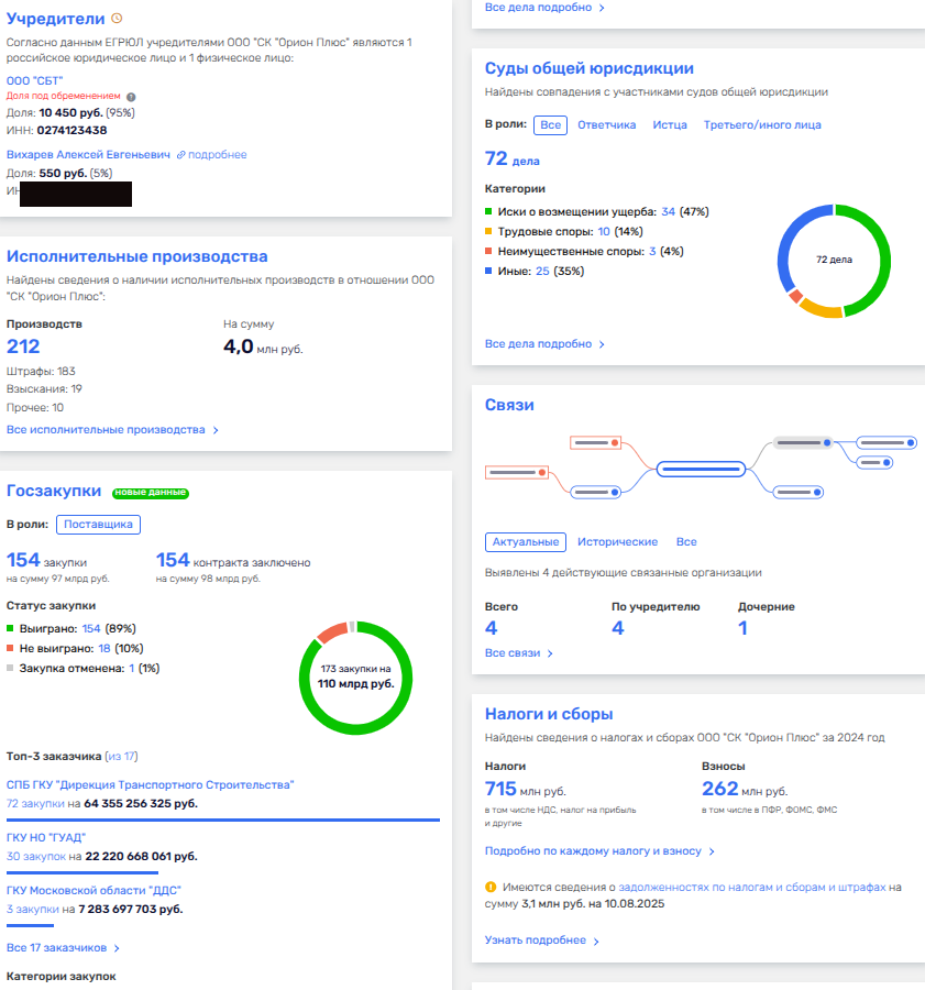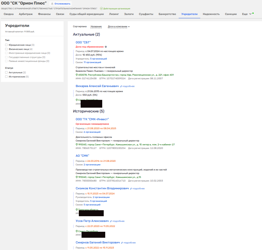На сегодня владельцами ООО «СК «Орион Плюс» являются Алексей Вихарев и некое ООО «СБТ», получившее 95% в июле 2024 года. Ранее в числе владельцев компании был Петр Усов - брат петербургского миллиардера Александра Усова. Последний - фигурант уголовного дела по весьма грязной статье - половое сношение с лицом, не достигшим 16 лет. После уголовного дела Усов сбежал в Европу и, вероятнее всего, обретается где-то в Прибалтике.