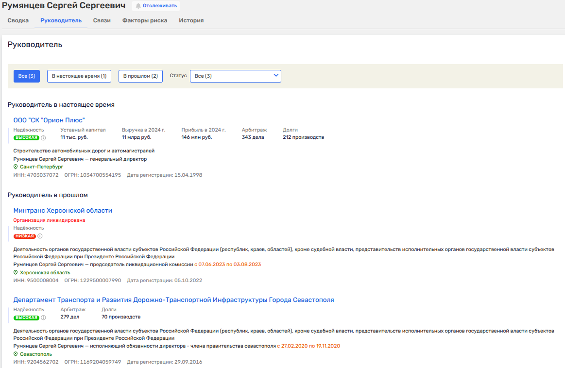 Прикрывает в качестве директора все эти безобразия в СК «Орион Плюс» с октября 2025 года бывший глава Минтранса Херсонской области, занимавший также пост главы профильного дорожного департамента Севастополя Сергей Румянцев.