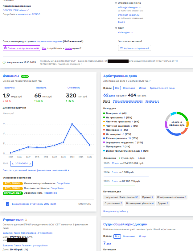 Более того, из общего показателя наколоченного на бюджетных контрактах 98 млрд рублей - более 64 млрд рублей обеспечила как раз таки дирекция. При этом заказчиков даже не смущает, что у фирмы налоговые долги: на август 2025 года сумма составила 3,1 млн рублей.
