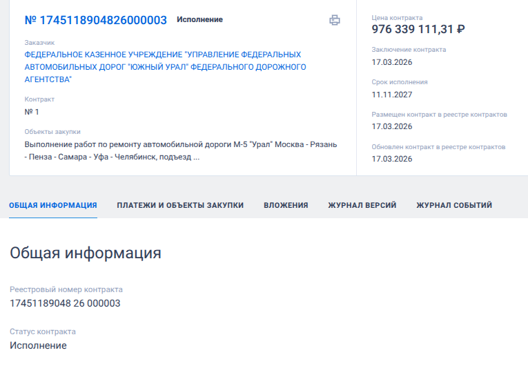 17 марта 2026 года ФКУ Упрдор «Южный Урал» подмахнуло дорожно-ремонтный госконтракт почти на 1 млрд рублей на дороги Челябинской области. Подрядчиком выбрали «Дортрансстрой» из Башкирии, которое в целом наколотило на подрядах более 121 млрд рублей, став любимчиком этого подрядчика, их коллег из ФКУ Упрдор «Приуралье» и УСРДИС администрации Уфы.
