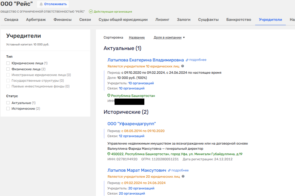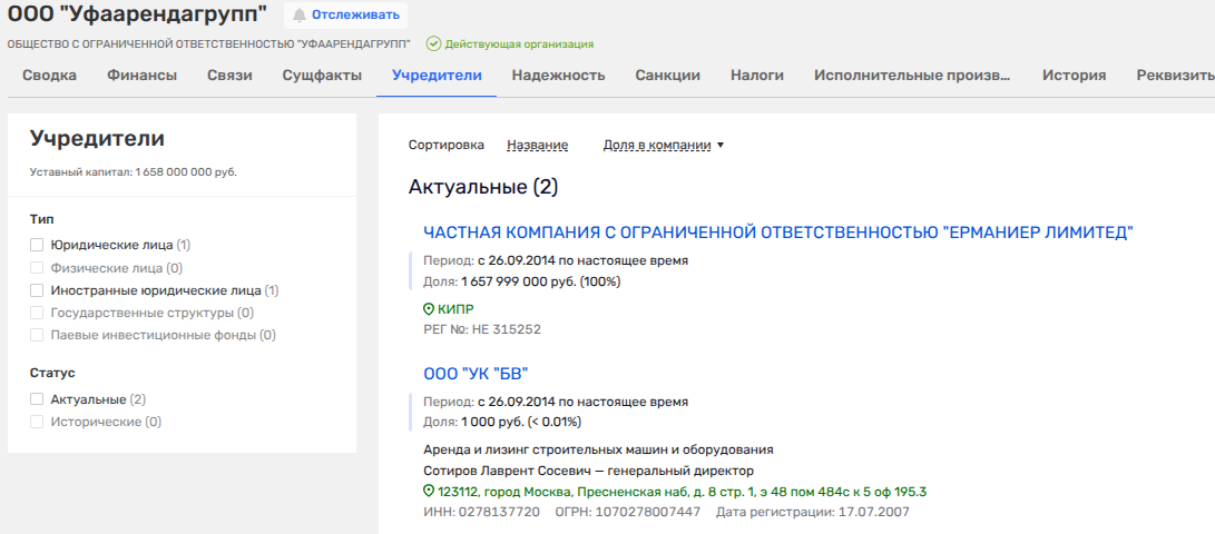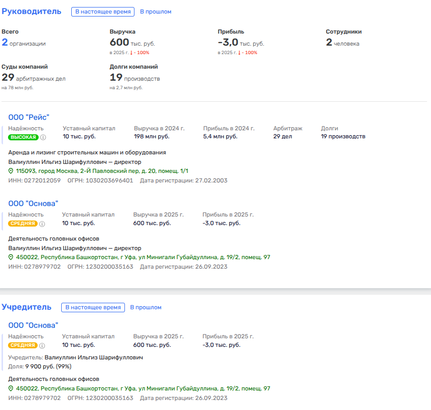 Так, в компании «Рейс» (аренда и лизинг строительных машин и оборудования), о которой мы рассказали выше, и кою возглавляет директор «Основы» Валиуллин, ранее имело долю «Уфаарендагрупп». Последняя пованивает как техническая фирма.