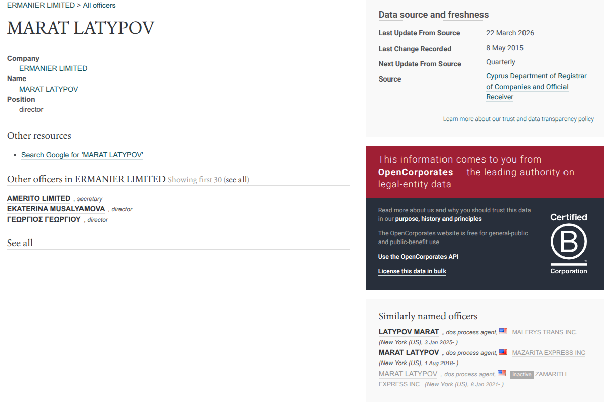 Более того, на некоего LATYPOV MARAT оформлено руководство американскими фирмами - MALFRYS TRANS INC., MAZARITA EXPRESS INC и ZAMARITH EXPRESS INC.