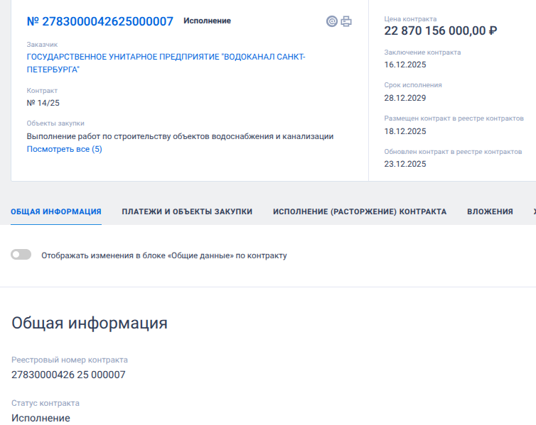 16 декабря 2025 года государственный водоканал Санкт-Петербурга подмахнул госконтракт на 22,87 млрд рублей единственному участнику соответствующего тендера (другим же деньги не нужны). Теперь победитель должен до 28 декабря 2029 года построить вторую нитку Главного канализационного коллектора северной части Санкт-Петербурга (2 и 3 этап).
