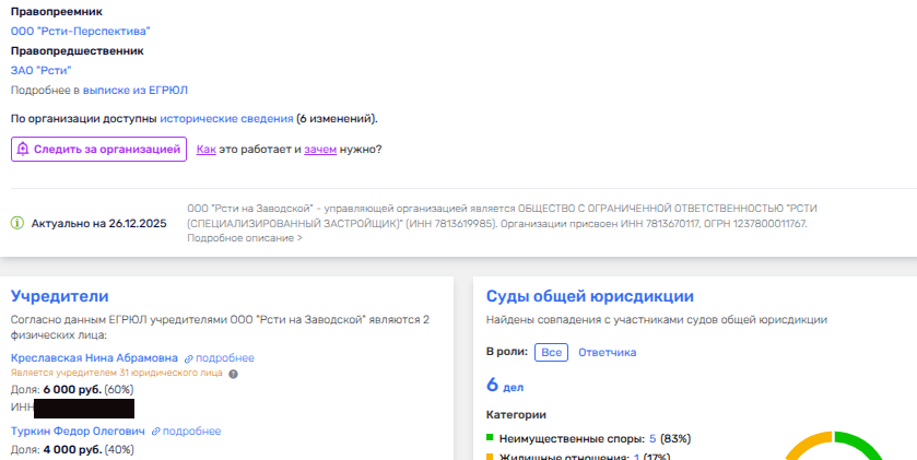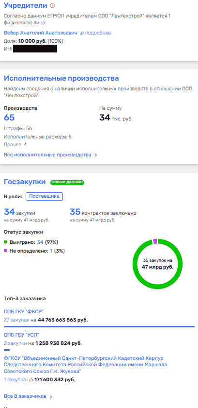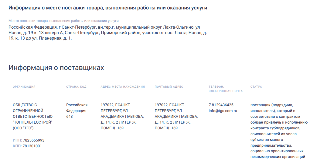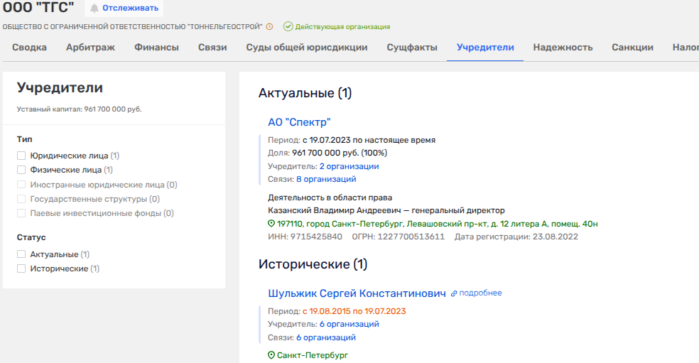 Победителем стало ООО «Тоннельгеострой» (ТГС), которое до июля 2023 года принадлежало лично питерскому олигарху Сергею Шульжику, а потом перешло к некоему АО «Спектр». Вот только на начало 2025 года владельцами АО являлись всё тот же Шульжик с долей 99,9% и Инна Сергеевна Шульжик. Как говорится, от перестановки слагаемых сумма не поменялась и контроль Шульжика над господрядчиком остался.