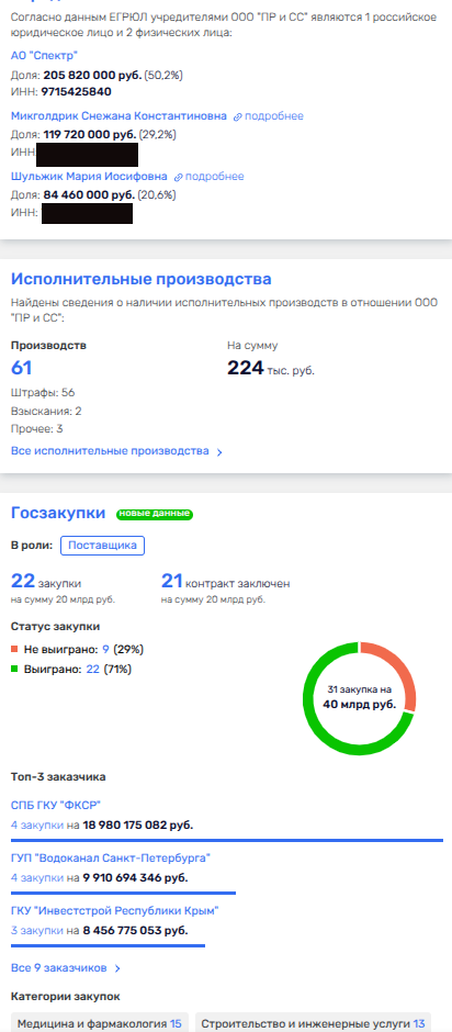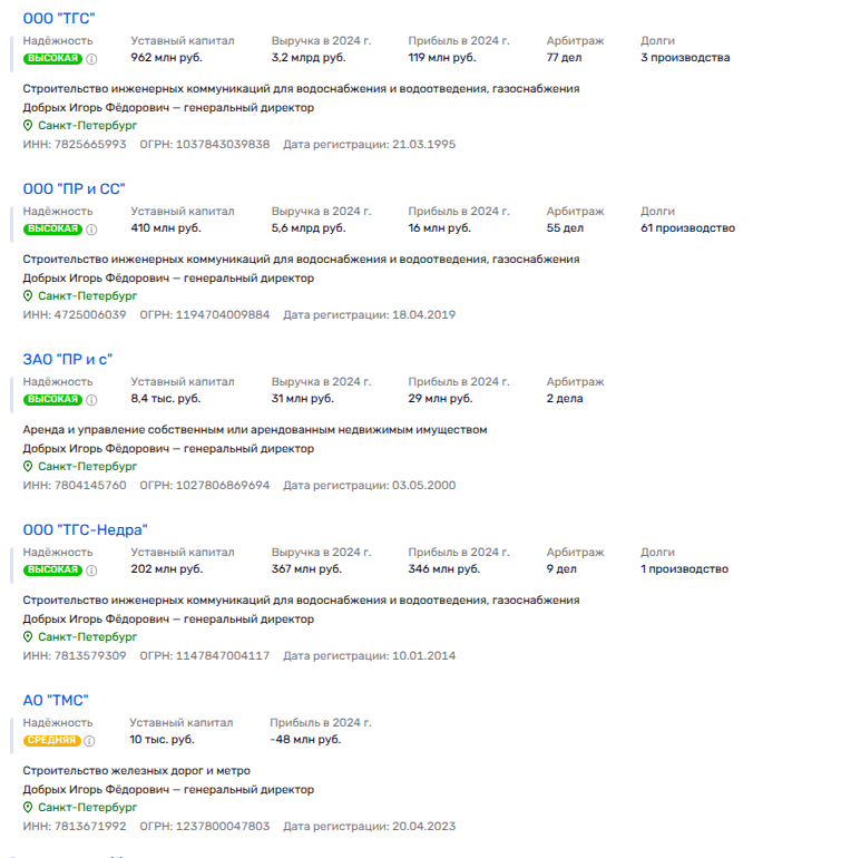 Более того, директором при смене владельца в ТГС остался человек Шульжиков - Игорь Добрых, который также возглавляет пачку активов семьи, в том числе тех что специализируются на строительстве инженерных коммуникаций для сетей водоснабжения, водоотведения и газоснабжения. Например, ООО «ПР и СС», которое наколотило на госконтрактах 20 млрд рублей, а среди владельцев не только АО «Спектр» Сергея Шульжика, но и Мария Шульжик. Там же некая Микголдрик Снежана, которая фигурирует и в ином бизнесе семьи олигарха.