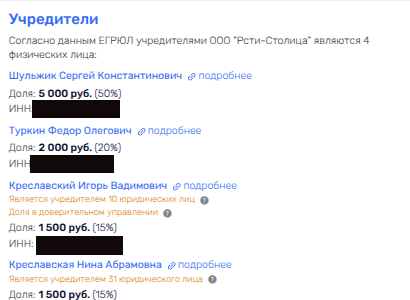 Вишенка на торте: Игорь и Нина Креславские, Федор Туркин - партнёры Сергея Шульжика по ООО «РСТИ-Столица». Возглавляет фирму Алексей Туркин - директор АО «СЗ Хлебозавод №16», преемник московского госпредприятия - ГУП «Хлебозавод №16», которое чудным образом уплыло в руки Шульжика и Креславских.