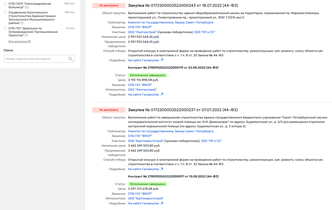 А вот 25 октября 2022 года госконтракт на 260 млн рублей (на строительство здания высокотехнологического медицинского корпуса СПб ГБУЗ Городская больница №15 Санкт-Петербурга) и 15 августа 2022 года - на 3,59 млрд рублей (на достройку здания Санкт-Петербургского НИИ скорой помощи им. И.И. Джанелидзе) фонд отдал уже ООО «БАЛТИНВЕСТСТРОЙ». И опять роль подтанцовки изображал ООО «ПР и СС» Шульжика.