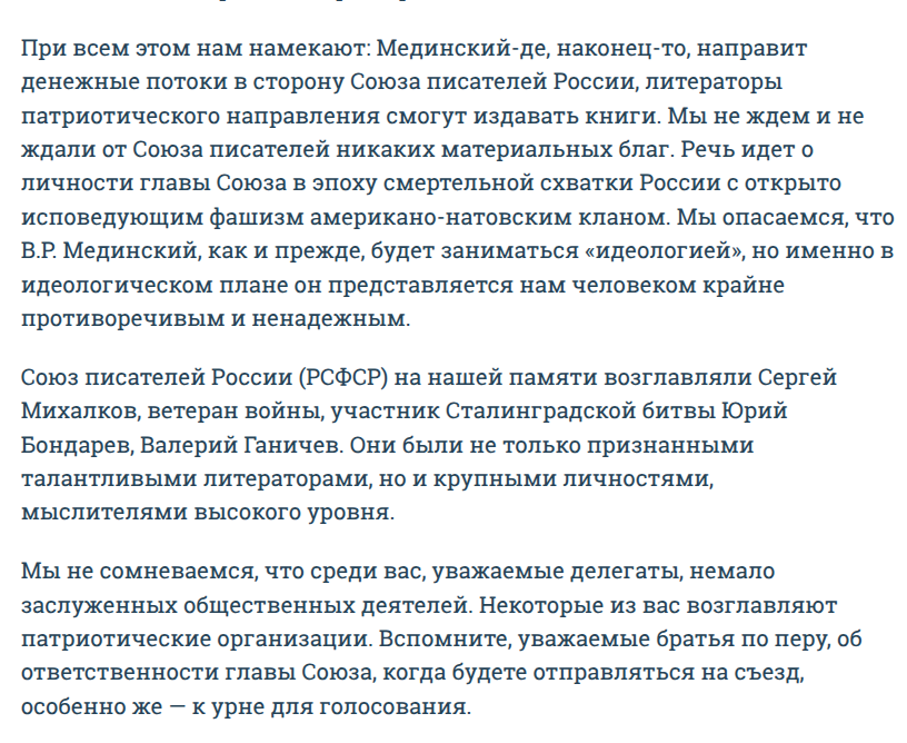 Когда в конце февраля 2025 года пошли слухи о том, что Союз писателей России возглавит токсичный Мединский, появилось открытое обращение к делегатам съезда с призывом не голосовать за надсмотрщика за культурой.