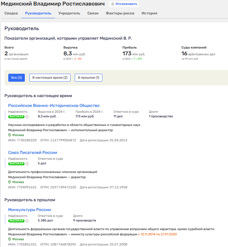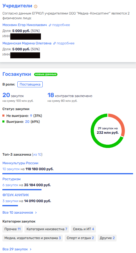 В свое время принадлежащая Москвину и Мединской строительная компания «СВ дот.ру» также выиграла несколько тендеров у Минкультуры и того же ФГБУК. Сейчас фирму передали компании Сергея Лобанова - ООО «Торггрупп».