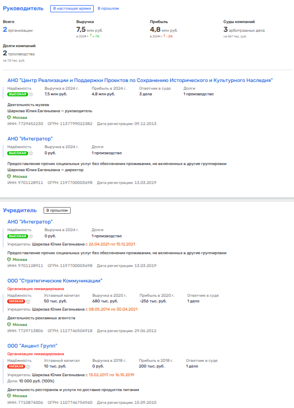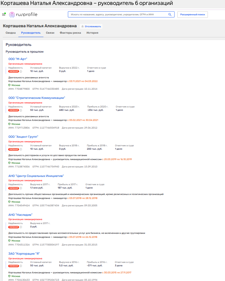 ЗАО «Корпорация Я» на сегодня ликвидировано, его ликвидатором была Наталья Корташева, которая также выступала ликвидатором целой пачки юрлиц, включая ООО «Стратегические Коммуникации». В числе владельцев последнего оказалась Юлия Шаркова, которая также является руководителем ресторанного ООО «Акцент Групп». Не оно ли планировали встроить в особняк Союза писателей?