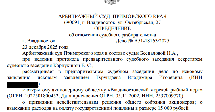 Кстати, несмотря на принятое решение о выкупе дарькинских долей, в ООО «ГЕОТЭКС» собственники не сменились и по сей день. Возможно, причина в том, что в арбитраже Приморья на сегодня слушается иск миноритария порта - некоего Владимира Турундаева. Он как раз таки оспаривает решения совета директоров, где были приняты выкупные решения. Заседание назначено на 5 февраля.