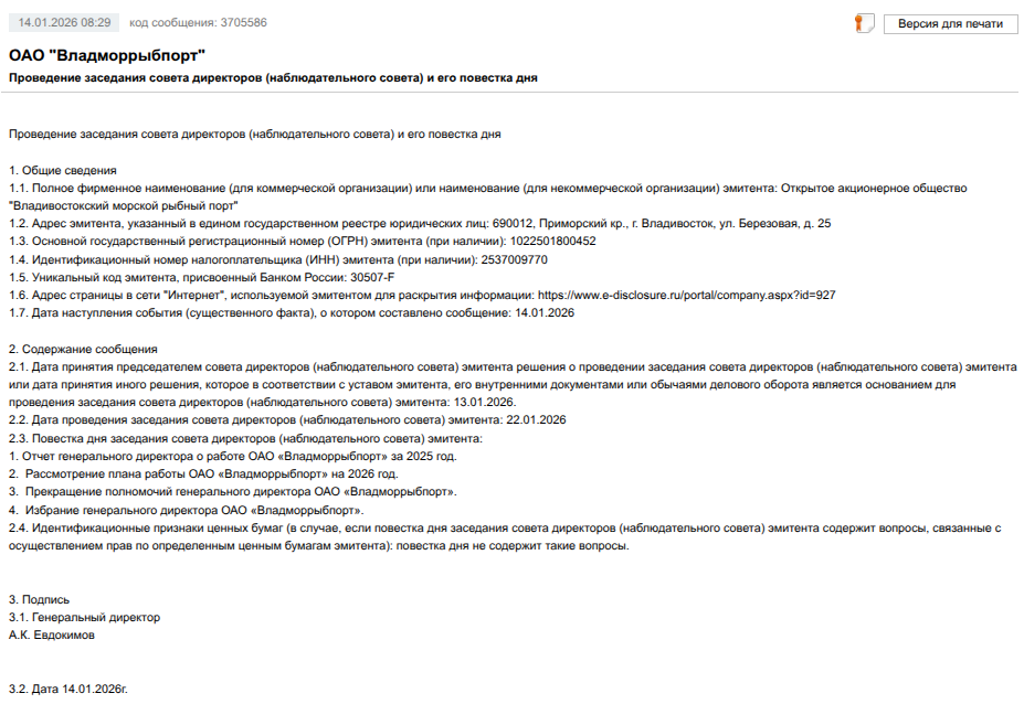 А теперь следите за руками: на 22 января 2026 года назначено заседания совета директоров, на котором будут прекращены полномочия Евдокимова как гендиректора и избран новый руководитель.